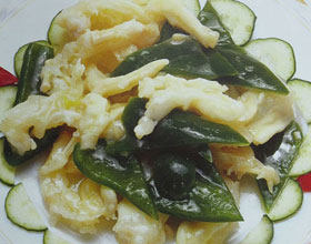 4. 再投入鸭掌、青椒,加入绍酒、味精和少量清汤煮沸,用水淀粉勾芡,翻炒几下浇上卤汁起锅即可。
