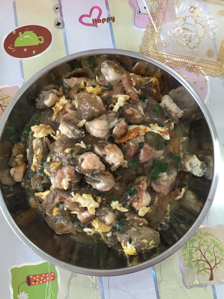 3. 锅内倒入四五勺油烧开,倒入粉浆,摆放上肉,生蚝,大火煎,煎至金黄色就可以翻身来,打入鸡蛋,煎至两面金黄就可以装盘了,吃的时候沾点酱油,辣椒油更香。
