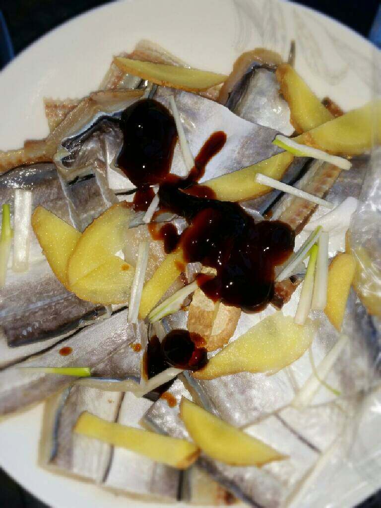 3. 保鲜膜封好,上锅蒸,水开6分钟。蒸过的姜葱捡出,放入新的姜葱丝,竖椒,倒入鱼豉油。