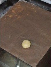 6. 开包:将一个面皮球放到油布上用另一侧对折过来,然后用手的大鱼际部分按压成大圆片