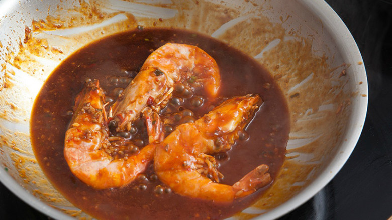 4. 炒锅留1/2步骤2中的酱汁,加入水和明虾一起炖煮让明虾入味