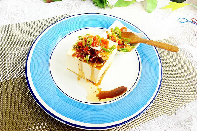 5. 水豆腐用开水烫一下、切十字花利于味道吸收、浇上炒好的配料和调料就OK