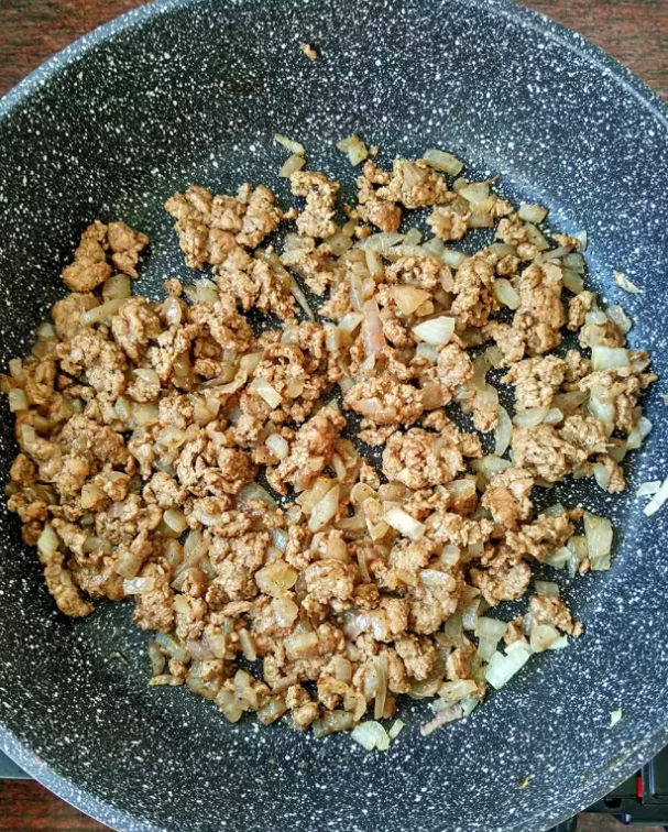 7. 将炒好的洋葱牛肉和土豆泥混合在一起。