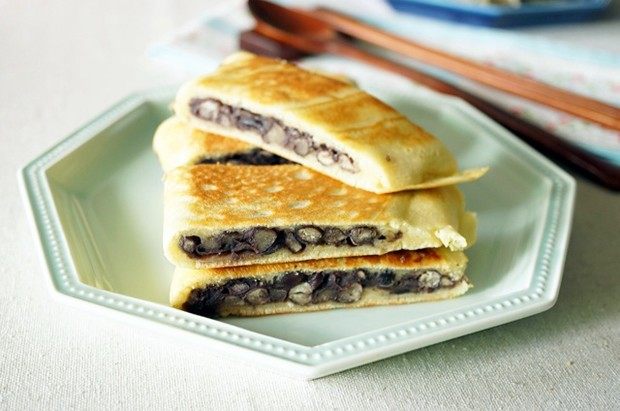 5. 在表面糊糊还未完全凝固时,迅速在半圆饼皮上均匀铺上一层蜜红豆,用平底铲将另外一半饼皮折叠,开口处轻轻压一压,使其粘合,这样蜜豆不会掉出来。然后两面轮换烙成金黄色,可用平底铲不停轻压饼身,使内部熟透