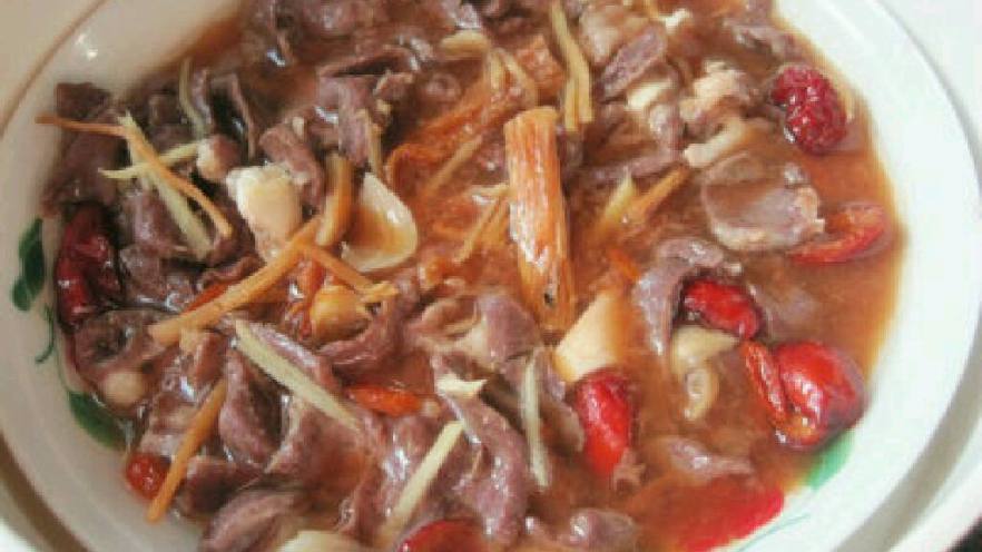 2. 处理好猪心,切片,放下当参,红枣,枸杞,姜,盐,油,还有料酒腌一会,就可以煮饭时一起煮了!