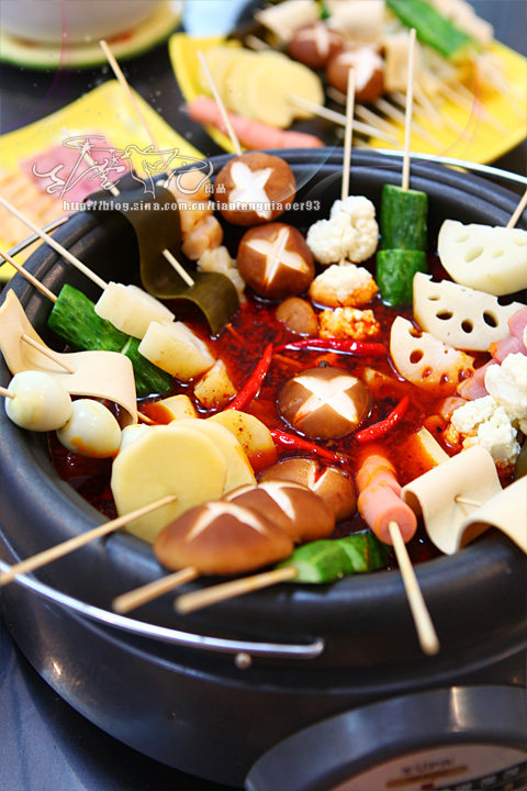 12. 加入豆瓣酱和麻辣烫底料、其它锅底调味料煮开,转入火锅中;