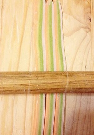 6. 然后把三条彩条用手按扁一点,两两相临的边缘刷点水,用擀面仗轻轻的按压的方式滚下去,切记不要太大力。