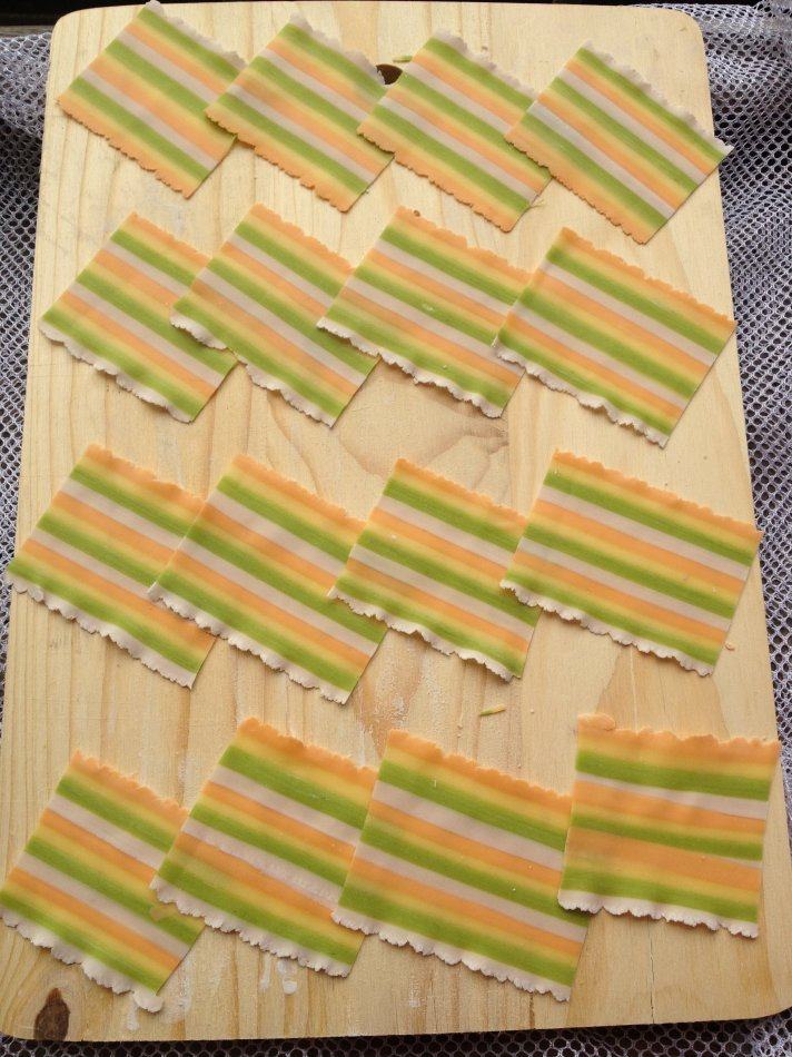 4. 用压面机1档来回折叠压面,直到面皮光滑,4个颜色面皮压好切成一样大小。