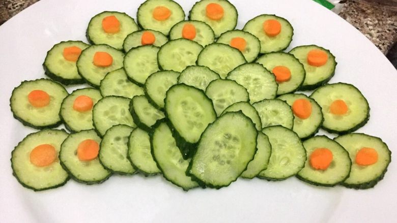 - 1.黄瓜切圆形片,最后切三片斜的。2.黄瓜尾巴要保留,摆好了孔雀的身体在进行调节黄瓜的角度。3.酱油很关键,最好用凉拌的酱油,味道好极了。