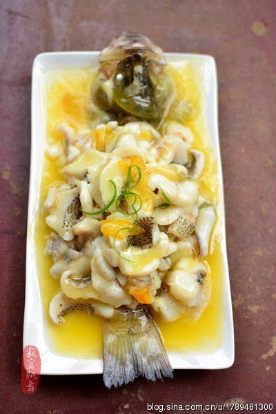 10. 接着等水再次烧开,放入鱼片看颜色变白即刻盛出摆在鱼身位置;