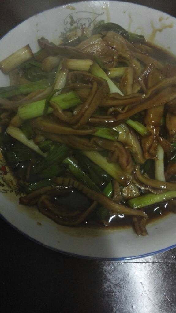 1. 热锅,把少许油,先把大蒜抄到半熟,再把猪肚到下去,再把鲜酱油,糖一起抄熟就✌