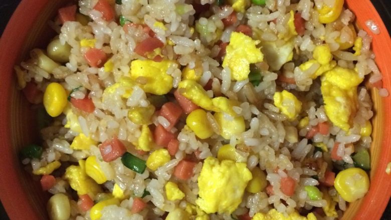 5. 1、首先把刚切好的火腿,黄瓜,玉米,绿豆豆(锅内倒入油)入锅中先炒,放少许的盐,炒好后盛起来,2、再次倒少许的油,鸡蛋打散,倒入锅中炒,变黄便盛起来,3、倒入适量的油,将米饭倒入锅中炒。4、将刚才盛起来的鸡蛋(黄瓜,玉米,绿豆豆)再次倒入锅中一起炒,加入适量的盐,酱油。煸炒之后便可以出锅咯🍽。