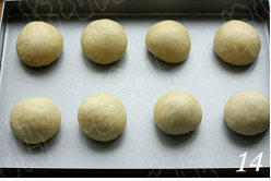 14. 将包好的面包坯排入烤盘,每份面团中间留出1-1.5倍的间隔;