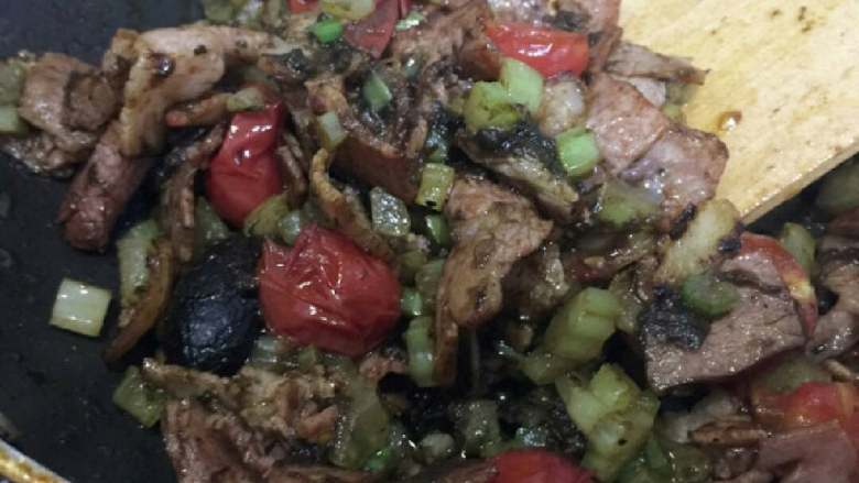 6. 倒入两大勺橄榄菜,芹菜丁,翻炒。