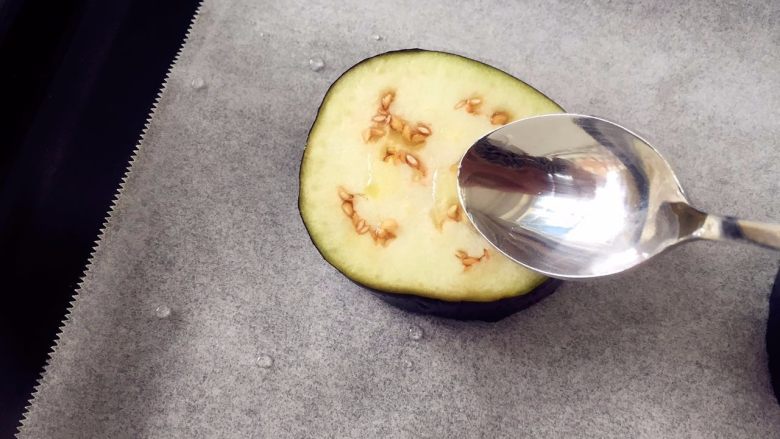 2. 将茄子平铺在铺好烘焙纸的烤盘中