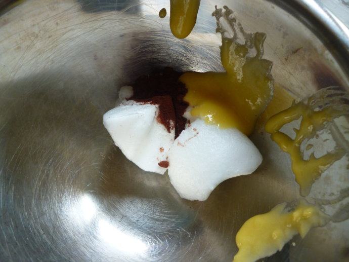 - A浅褐色:蛋黄面糊1t+1/4低筋面粉+可可粉1/8t+打发蛋白2T
