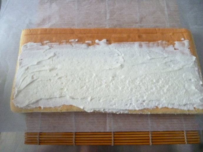 10. 蛋糕体以两侧图案切割成两部分,借用寿司卷,把蛋糕连同烘焙纸放在寿司卷上,均匀的抹上一层夹馅奶油后,轻轻卷起,用烘焙纸包住后两头固定放入冰箱冷藏约45分钟左右。