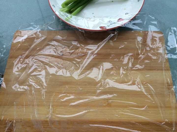 6. 铺好保鲜膜,把米饭放在保鲜膜上,再盖一层。