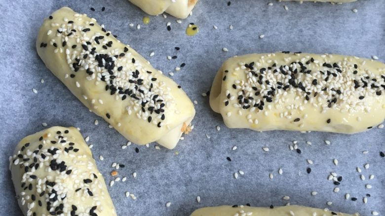 4. 刷上一成蛋液,还有芝麻,封上保鲜膜在进行二次发酵