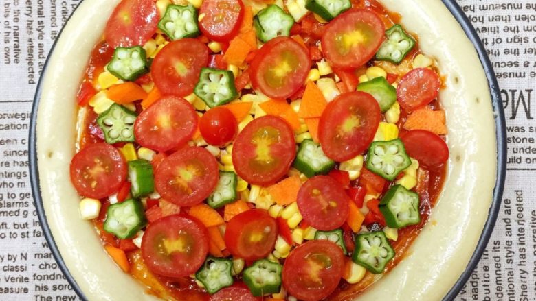11. 均匀撒上红辣椒碎,胡萝卜丁,秋葵,樱桃番茄。
