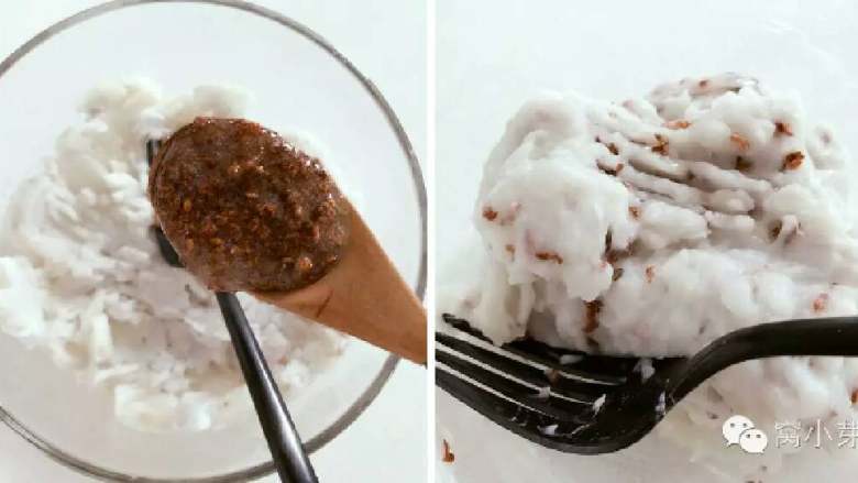 3. 把蒸熟的芋头捣烂,加入砂糖搅拌均匀,砂糖要趁热加入,如果融化不了,可以连碗放入蒸锅中再加热一会。 》嘿嘿,做到一半想起冰箱里有桂花蜜酱,就把砂糖换成桂花酱了哈。 》如果用的芋头很粉,无法成团,此时可加入少许牛奶搅拌。