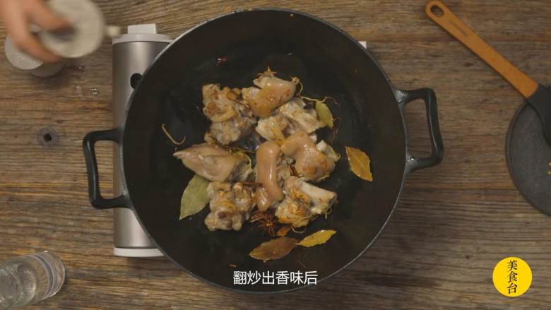 6. 热锅起油,倒入猪手煸出油脂,加入姜丝、干红椒、八角、肉桂、香叶翻炒