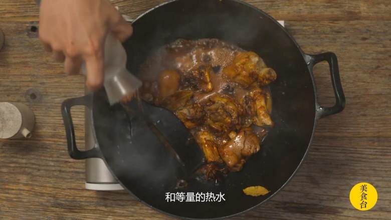7. 翻炒出香味后,倒入少许老抽上色,加生抽调味,再倒入可乐和等量的水没过猪手