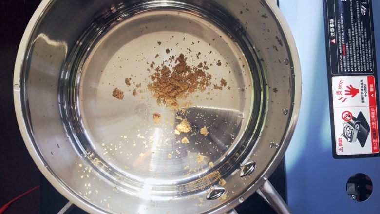1. 将黄金幼砂糖倒入锅中,稍微加热一下。