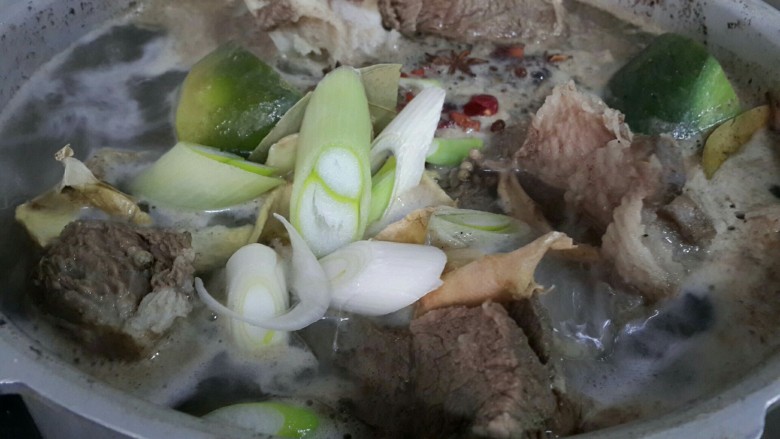 3. 驴腿肉(骨头也一起)配料,调料一起入锅,加水焖