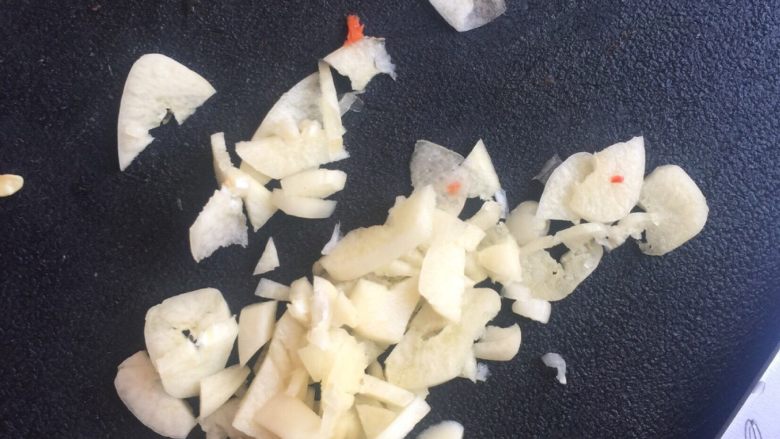 8. 用植物油小火煸香蒜头,关火。加入味级鲜、味精、芝麻油拌匀。