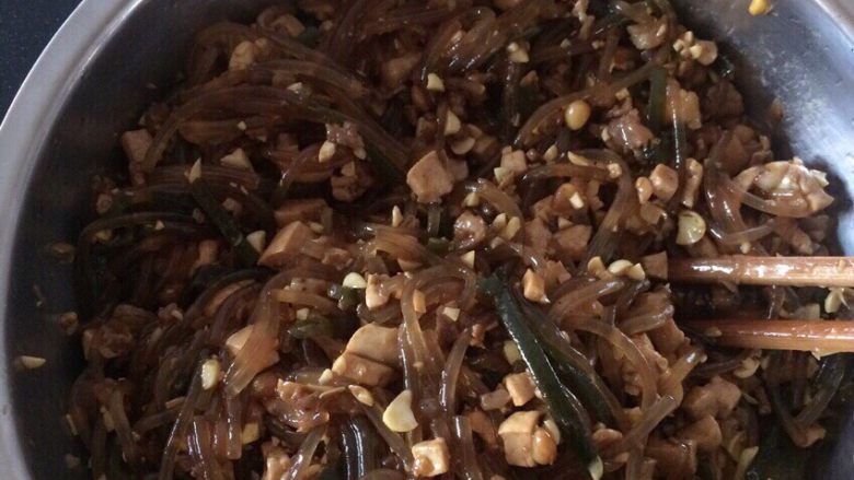 4. 豆腐煎好后,倒入盘子里,备用,锅内在加入食用油,放入两粒大料,大料变黑后捞出,丢弃~加入一小勺白糖,带白糖化开后,倒入肉沫,炒制变色后加入老抽,盐,料酒,五香粉,蚝油等调味品后,加入黄豆芽碎,炒一会,在加入煎好的豆腐,海带丝,粉条,翻炒好后,关火晾凉~待用