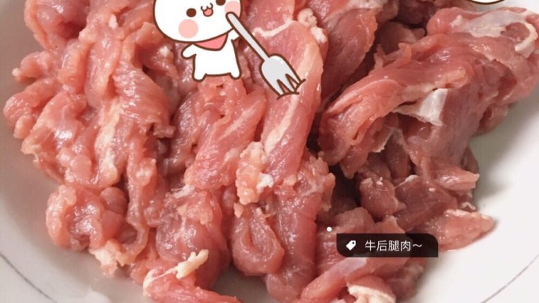 1. 首选牛后腿肉 将后腿肉按牛肉条纹切丝