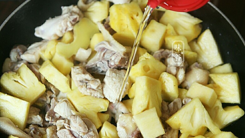 7. 待菠萝香味溢出时倒入水,水量刚好没过鸡肉。