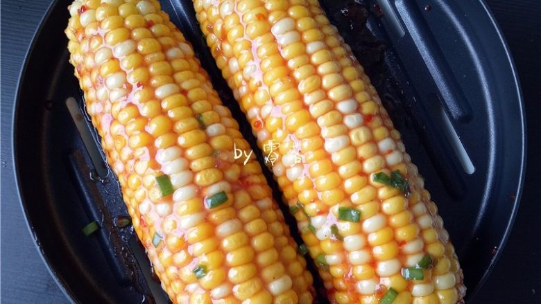 9. 20分钟结束后,给玉米翻面,再刷上叉烧酱混合物、黄油、葱花等(葱花依然可省略);