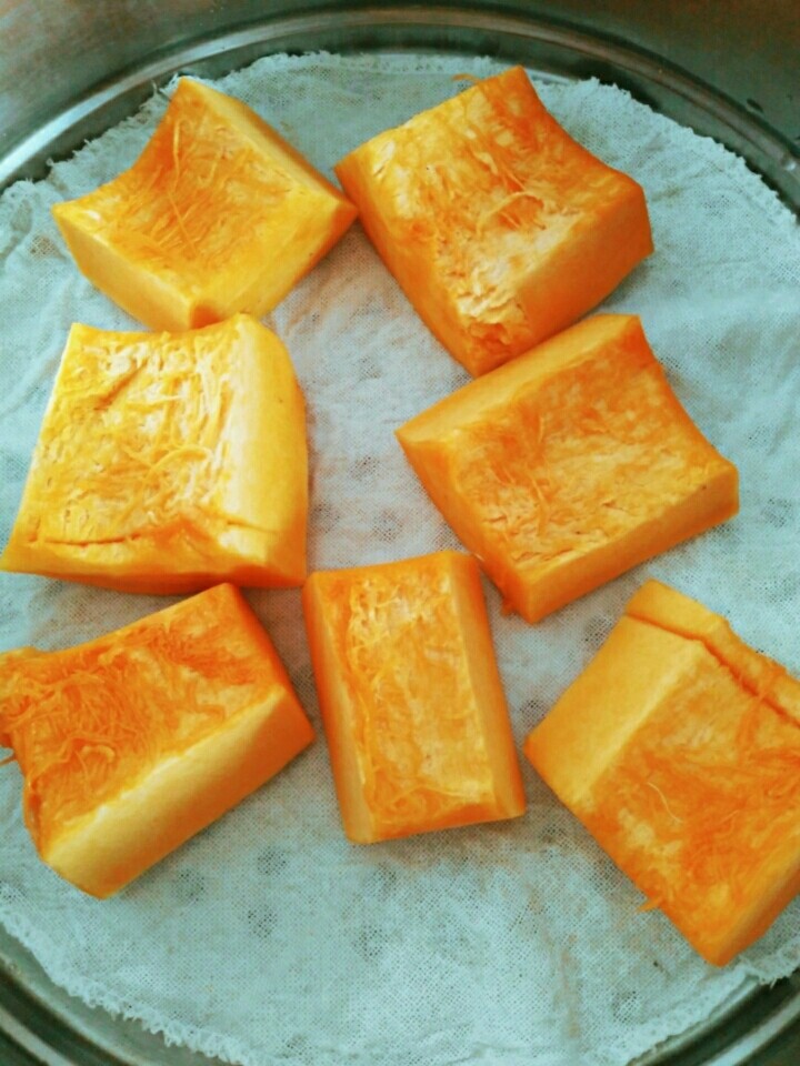 1. 把南瓜去皮,去瓤,放在锅上蒸熟备用