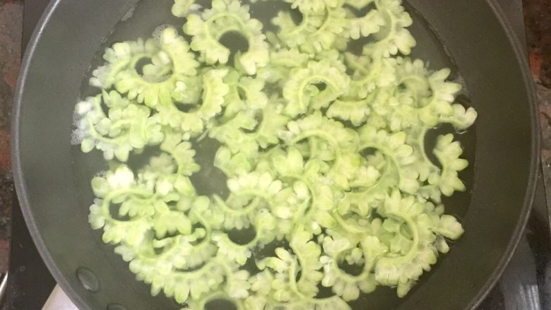 3. 将盐腌过的苦瓜下锅焯水,凉水没过苦瓜,大火煮沸后再煮1分钟即可关火。苦瓜要尽量切薄,这样焯水的时候就刚好熟了,熟而不烂的苦瓜口感最好,又脆又没有青涩感