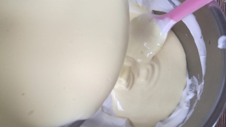 14. 取三分之一蛋白加入蛋黄盆内,切拌或翻拌混合均匀,不可划圈搅拌,以免消泡。