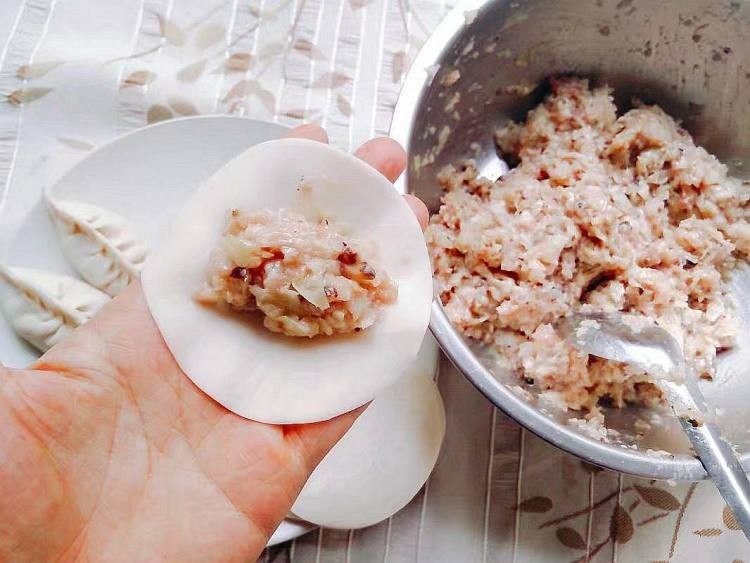 8. 擀好饺子皮后那一张放入一勺馅料捏紧即可