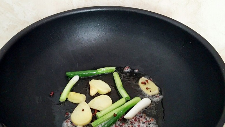 6. 炒锅中放入两汤匙花生油,放入花椒粒,姜片,葱段炝锅出味。
