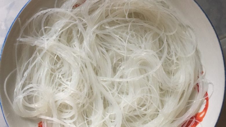 4. 用冷水浸泡4~5分钟的粉丝,平铺在盘底