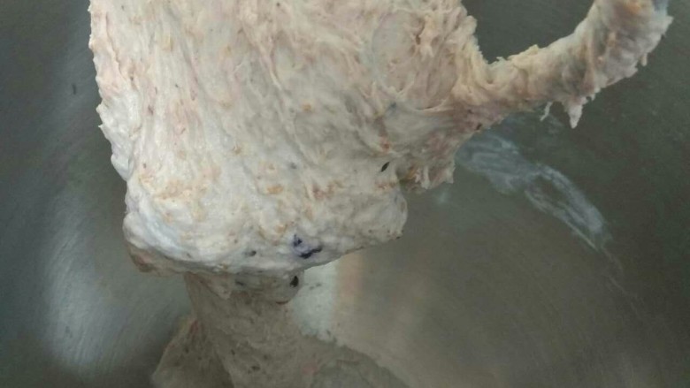 3. 先低速搅拌至油完全吸收,前后再中高速搅拌至面团完全成团,不沾底,表面光滑。 停下检查,基本完全接近手套膜(有全麦粉和蓝莓很难成和纯高筋粉面团的白白胖胖的手套膜相比)。