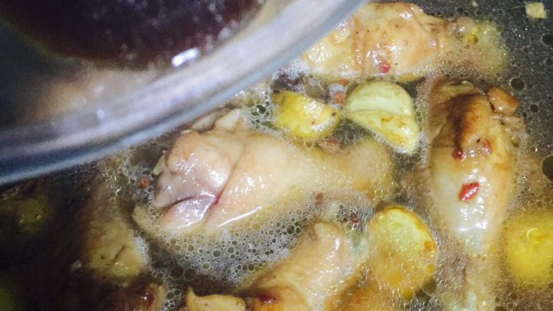 15. 将腌制鸡翅根用的剩余调料倒入锅中
