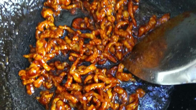 10. 锅热,放入适量植物油,放入腌好的肉丝翻炒至变色
