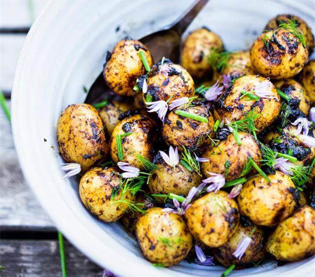 6. 加入1汤匙的油醋汁拌匀,使土豆薄薄裹上一层即可。