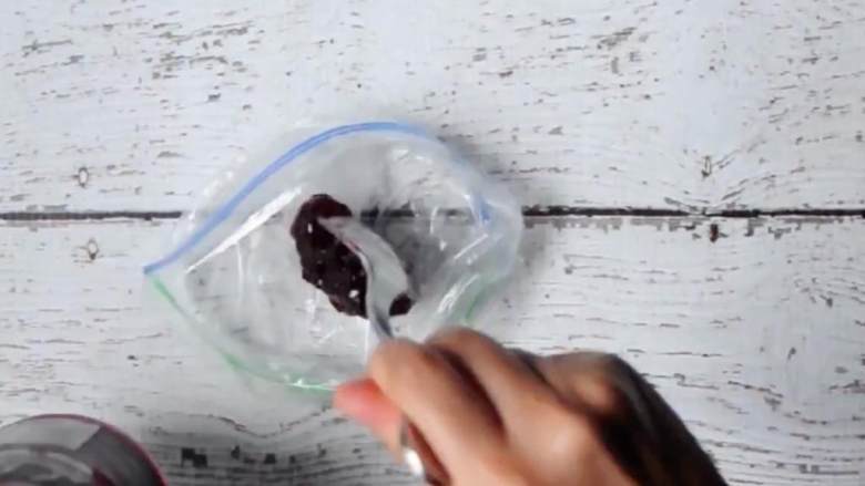 11. 把果酱挤到密封袋底部的一边,在尖角出剪开小口,备用。