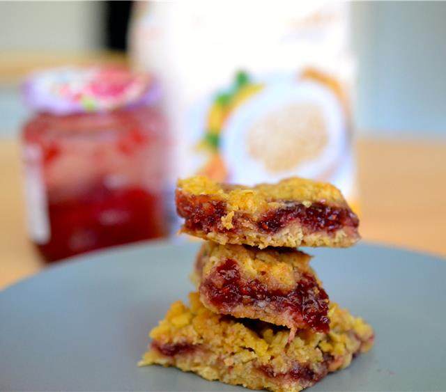 7. 将剩下的面团压在覆盆子果酱上铺好。烤35分钟,如果你发现顶部颜色烤得太深就盖上一层铝锡纸。