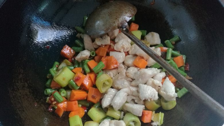 15. 加入豇豆丁红萝卜丁,翻炒两下,下入鸡丁。