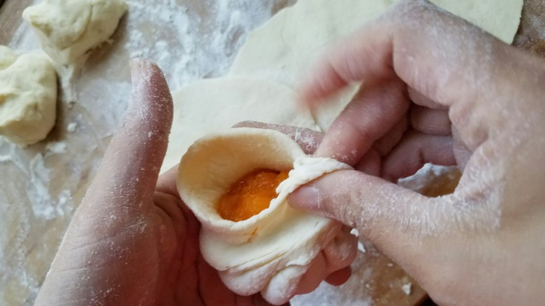9. 在面皮里加入南瓜泥,捏好褶封口。