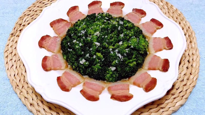 9. 蒜蓉西兰花摆入盘中五花肉摆在外围好漂亮哦做好的芡汁均匀的淋在西兰花上即可