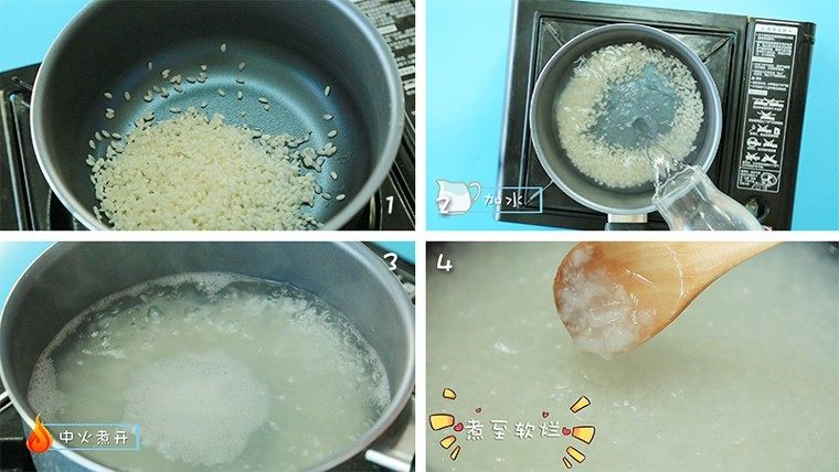 2. 大米放入小奶锅中,加入足量的水,中火煮开后转小火煮至软烂。
